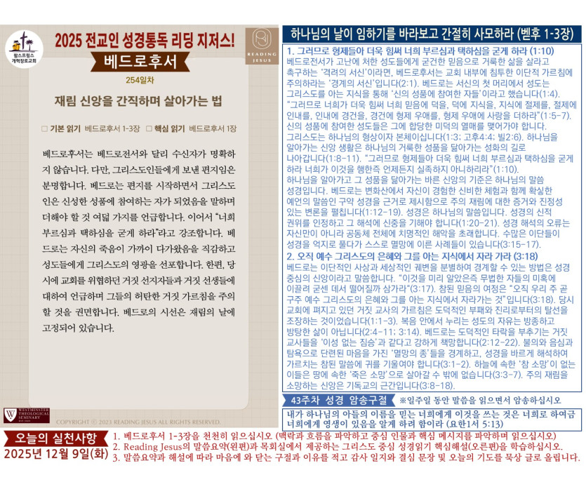 할렐루야! 2025년 전교인성경통독 리딩 지저스 제254일차 말씀은 베드로후서 1-3장입니다.