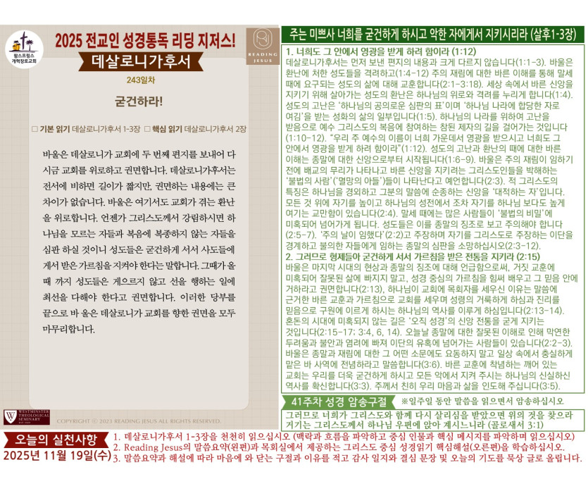 할렐루야! 2025년 전교인성경통독 리딩 지저스 제243일차 말씀은 살후 1-3장입니다.