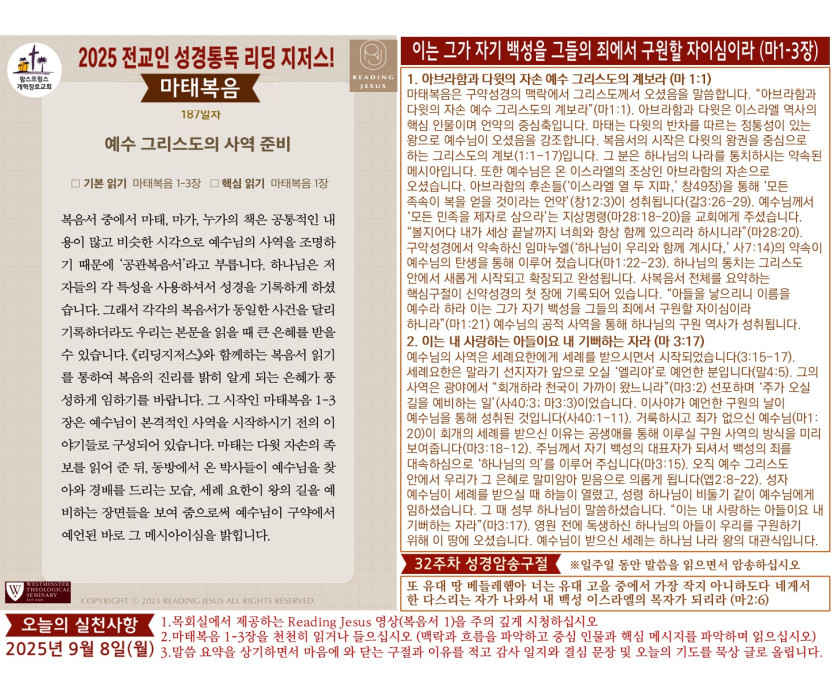 할렐루야! 2025년 전교인성경통독 리딩 지저스 제187일차 말씀은 마태복음 입니다.