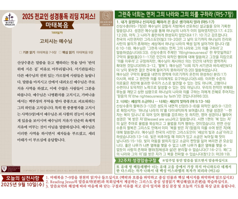 할렐루야! 2025년 전교인성경통독 리딩 지저스 제189일차 말씀은 마태복음 7-9장입니다.