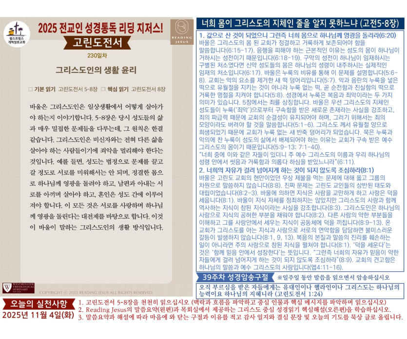 할렐루야! 2025년 전교인성경통독 리딩 지저스 제230일차 말씀은 고린도전서 5-8장입니다.