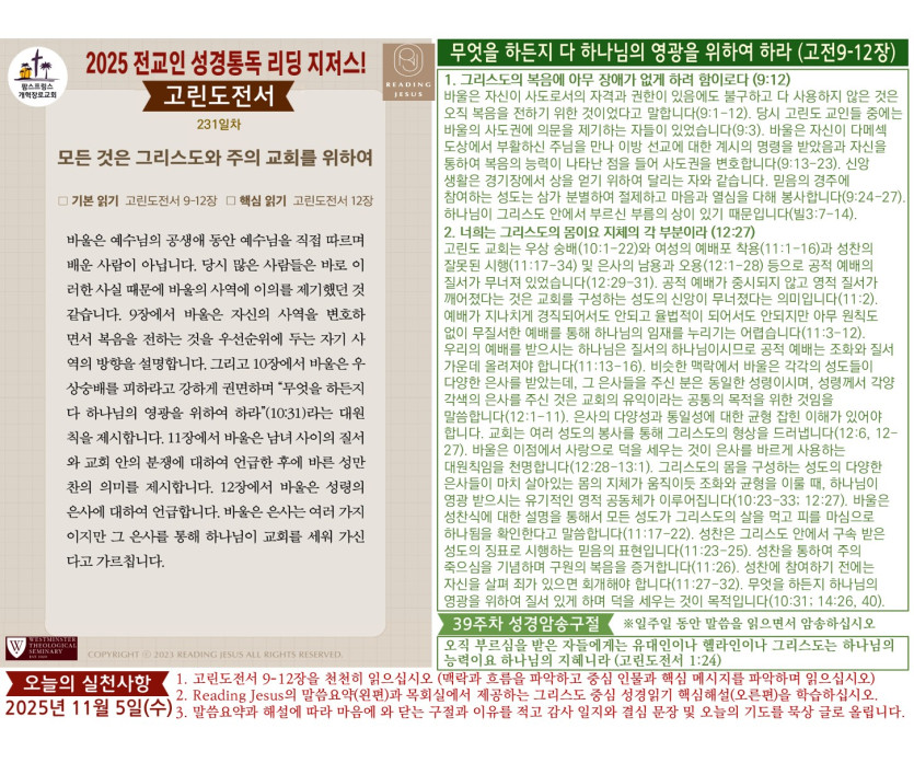 할렐루야! 2025년 전교인성경통독 리딩 지저스 제231일차 말씀은 고린도전서 9-12장입니다.