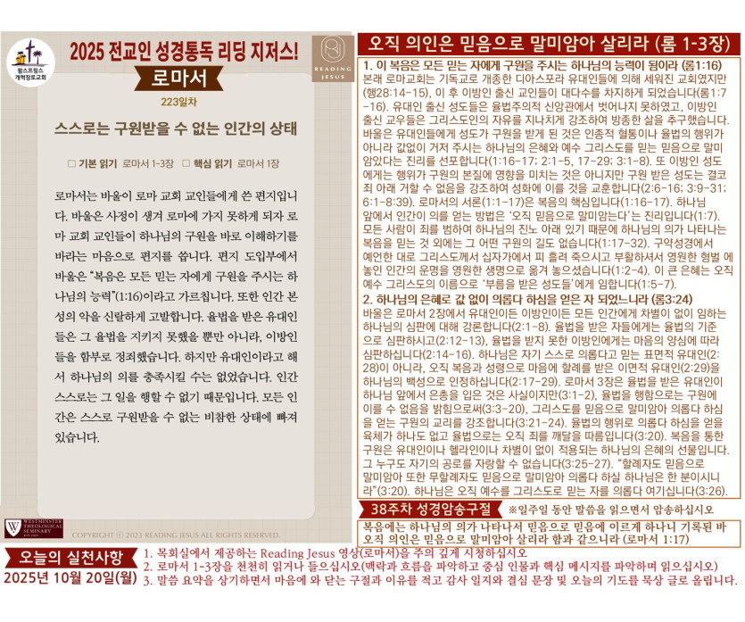 (2025년 10월 20일) '리딩 지저스' 성경읽기 영상과 말씀요약/본문해설 (제223일차)