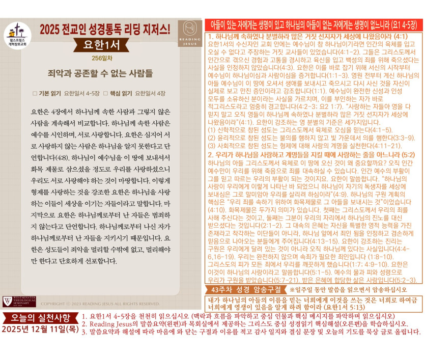 할렐루야! 2025년 전교인성경통독 리딩 지저스 제256일차 말씀은 요일 4-5장입니다.
