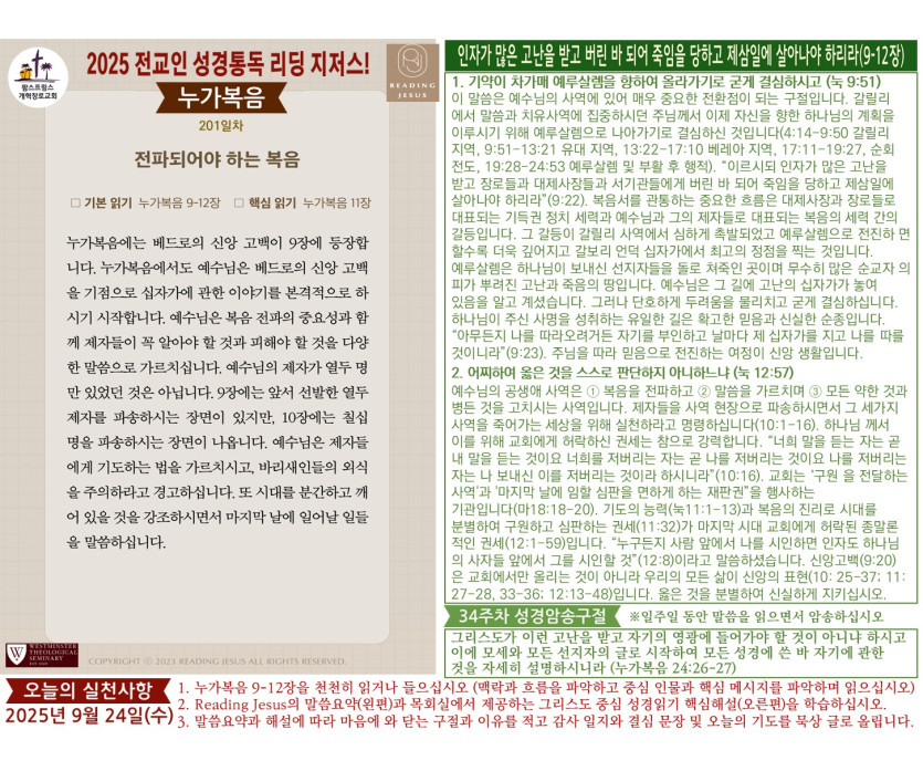 할렐루야! 2025년 전교인성경통독 리딩 지저스 제201일차 말씀은 누가복음 9-12장입니다.