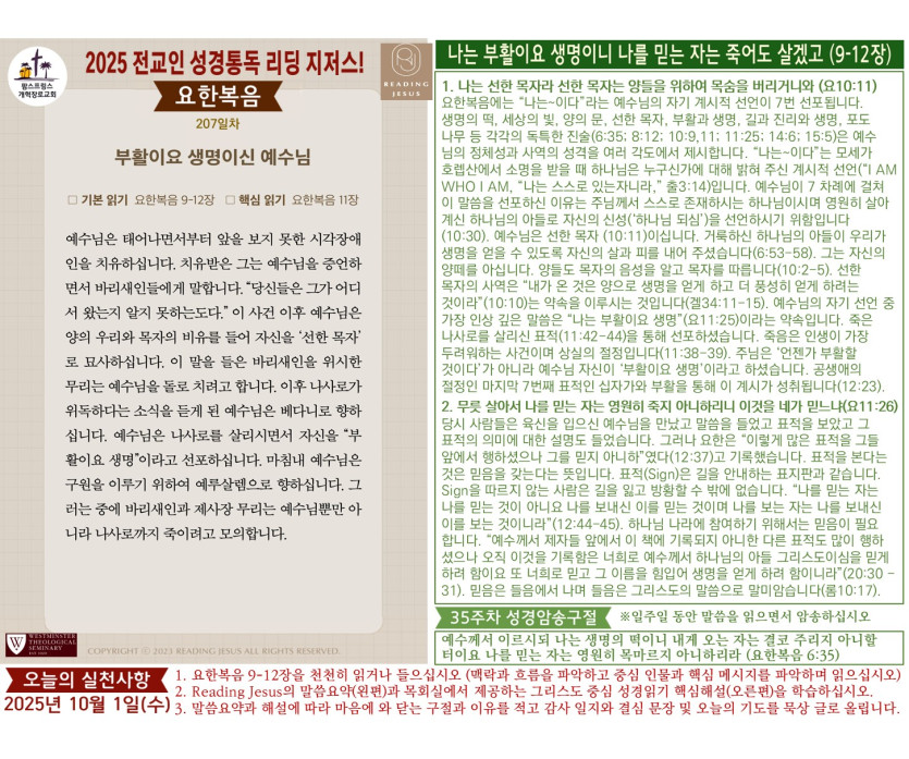 할렐루야! 2025년 전교인성경통독 리딩 지저스 제207일차 말씀은 요한복음 9-12장입니다.