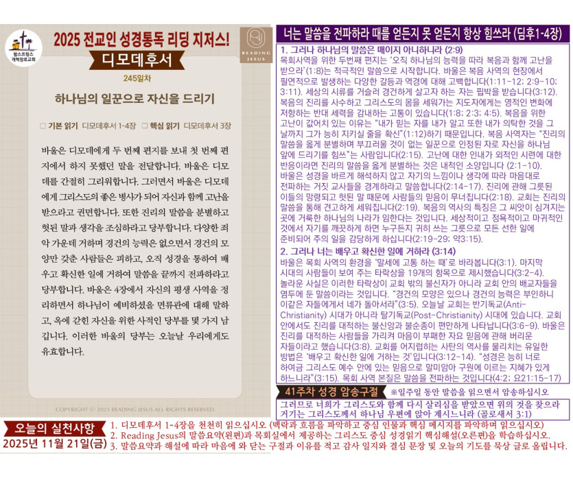 할렐루야! 2025년 전교인성경통독 리딩 지저스 제245일차 말씀은 딤후 1-4장입니다.