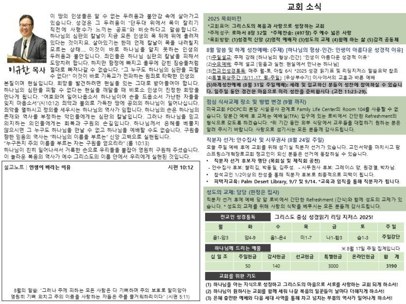 제3권 34호 페이지 정보 작성자 팜스프링스개혁장로교회 조회 76회 작성일 25-08-24 06:56 목록 본문 2025년 8월 24일 교회 주보입니다. 이전글제3권 35호 25.08.30 다음글제3권 33호 25.08.16