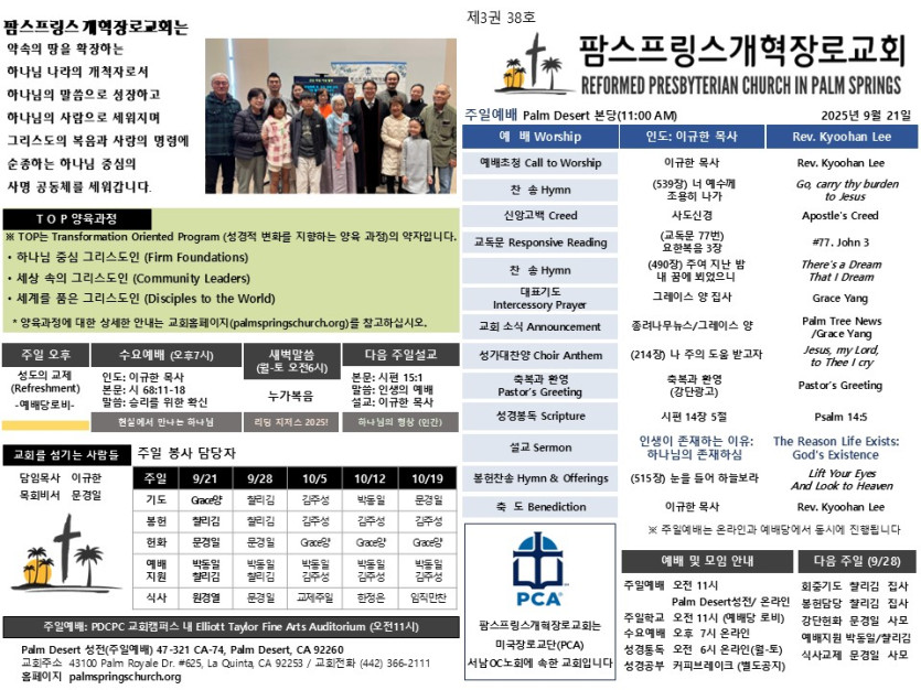 제3권 38호 페이지 정보 작성자 팜스프링스개혁장로교회 조회 31회 작성일 25-09-20 17:24 목록 본문 2025년 9월 21일 교회 주보입니다. 이전글제3권 39호 25.09.27 다음글제3권 37호 25.09.13