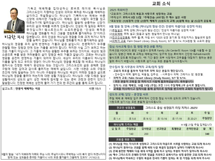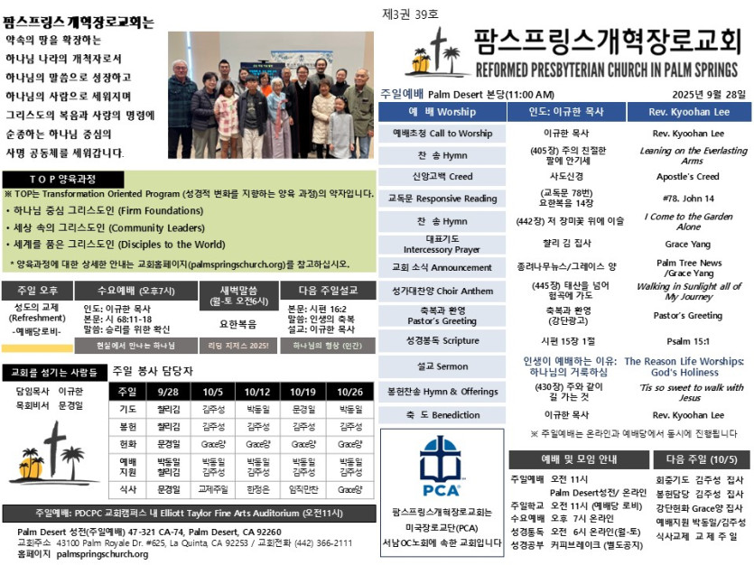 제3권 39호 페이지 정보 작성자 팜스프링스개혁장로교회 조회 33회 작성일 25-09-27 14:03 목록 본문 2025년 9월 28일 교회주보입니다. 이전글제3권 40호 25.10.04 다음글제3권 38호 25.09.20