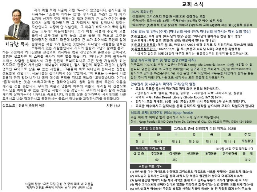 제3권 40호 페이지 정보 작성자 팜스프링스개혁장로교회 조회 8회 작성일 25-10-04 13:57 목록 본문 2025년 10월 5일 교회 주보입니다. 다음글제3권 39호 25.09.27