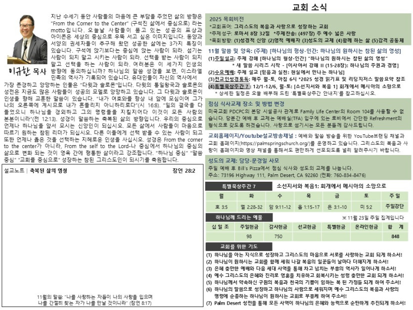 제3권 48호 페이지 정보 작성자 팜스프링스개혁장로교회 조회 8회 작성일 25-11-29 14:52 목록 본문 2025년 11월 30일 교회 주보입니다. 다음글제3권 47호 25.11.22