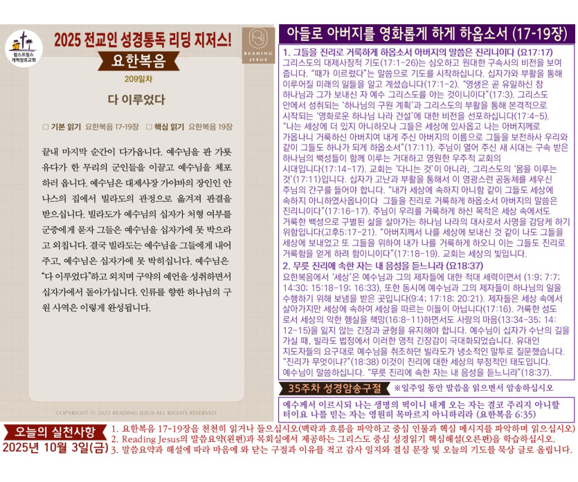 할렐루야! 2025년 전교인성경통독 리딩 지저스 제209일차 말씀은 요한복음 17-19장입니다.