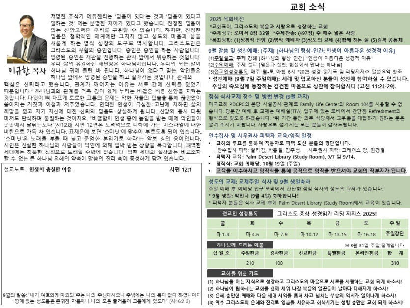 제3권 36호 페이지 정보 작성자 팜스프링스개혁장로교회 조회 42회 작성일 25-09-06 08:05 목록 본문 2025년 9월 7일 교회 주보입니다. 이전글제3권 37호 25.09.13 다음글제3권 35호 25.08.30